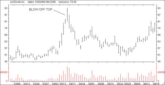 Often bull to bear market transitions follow what is referred to as a "blow off top". Although this condition is not necessary for a major reversal to develop, it is critical that you have an understanding of its structure and act accordingly if one occurs. A blow off top usually occurs in the final phase of an extended up move. The blow off takes place on very high volume as the stock explodes to the upside, reverses and closes down for the day. The dynamics that create a blow off top develop from a buying exhaustion by the bulls who unload all of their firepower and are then overwhelmed by the supply of stock that comes out of the woodwork by the bears. Typically, this type of action occurs after a sustained advance that deletes the bull's cash reserves and, thus, support for the stock. If you ever experience a blow off top, prepare for an extended bear phase to develop. The chart located below of Excite is a good example of a blow off top that occurred in mid-April 1998 as the stock spiked to 93 prior to trading down to the mid-70's the following day.