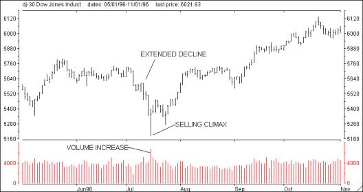 Frequently, a bear to bull market transition follows what is referred to as a "selling climax". A selling climax usually occurs in the final phases of a bear market but can also occur at the end of a corrective phase. Typically, the stock or index will have been in a long downtrend. The reversal occurs on very high volume as the stock collapses to the downside, reverses and closes up for the day. As with blow off tops, an imbalance occurs as the crowd throws in the towel convinced that the stock is going to zero. Since this usually occurs after a sustained sell off, cash is abundant creating the fuel to launch a new bull phase. A selling climax usually spells the end of a bear phase and the beginning of a sustained up move. The chart below shows a selling cimax that occurred in mid-July 1996 which set the stage for a rally by the Dow for the remainder of the year. ![]()