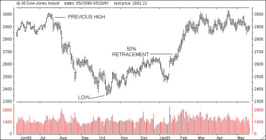 Many times a stock or index will decline for a period of time and then begin what appears to be a significant rally. Typically, this move will extend over a long period of time and penetrate the 50-day simple moving average. From a bar chart, measure the total number of points from the previous peak to the most recent bottom. As the stock rallies, if it gains more than 50% of the prior decline, the odds are very high that it will recover the entire loss. The faster the 50% retracement occurs, the higher the odds are that the entire retracement will occur. In the example below, the DJIA dropped from 3,000 to 2350 from July 1990 to mid-October 1990, a total of 650 points. By late January 1991, the DJIA had regained over half of the loss, 325 points, as it moved above 2675. This move represented a 50% retracement of the previous decline and suggested that the DJIA would regain the entire loss before the rally was over. This was accomplished in early march 1991 as the DJIA went on to make a new high. ![]() The 50% retracement is the most common of the three situations that we have highlighted. It is also valid in the opposite scenario, after a sustained rally. If 50% of an up move is retraced, anticipate a retracement of the entire move. Fifty-percent retracements occur over and over again providing exceptional profit opportunities for the astute trader. |