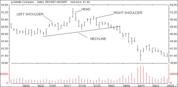 The chart below of Gillette (G) is a good example of a head and shoulder formation that occurred in the summer of 1997. Note that the neckline was broken during the first week of August when G traded below 48. The difference between the head (53) and the neckline (47) was six points. Subtracting six from 47 leaves an initial downward price projection of 41. Gillette traded down to 41 on 08/15/97, rallied for three days up to 44 and then headed back down.