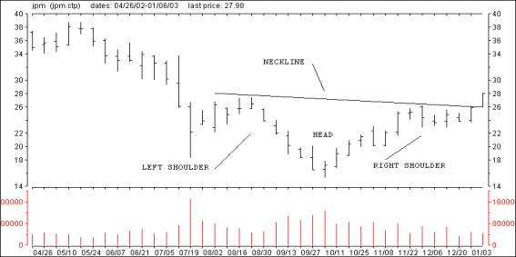 ![]() The chart below of JP Morgan (JP) is a good example of a reverse head and shoulders formation. Note that the neckline was broken on 01/06/03 when JPM traded above 26. The difference between the head (15) and the neckline (26) is 11 points. Adding 11 to 26 leaves an initial upside price projection of 37 which would be a return to the May 2002 high. ![]() |
