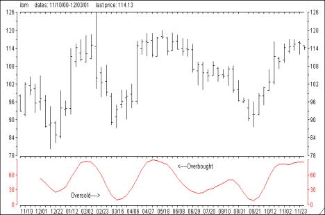 The first graph located below is a chart of IBM with the Slow %K stochastic oscillator plotted at the bottom. Both overbought (over 80) and oversold (under 20) areas are labeled. Note that on the week ending 3/16/00, Slow %K dipped below 20 as IBM closed at 95. This represented a very oversold situation and an excellent time to purchase IBM shares. IBM proceeded to rally over the next six weeks, topping out at 118 as Slow %K soared to over 80, an overbought condition.