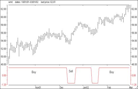 The second chart is Wal-Mart (WMT) from 10/01/01 through 03/01/02 with the MACD-LT indicator plotted below. During this period the market was in a strong trend coming off the September lows. MACD-LT stands for moving average convergence-divergence-long term. MACD, developed by Gerald Appel, consists of three exponential moving averages of a stock's closing price. Exponential moving averages assign greater weight to the most recent price data and therefore is more sensitive than simple moving averages. The MACD indictor has a Differential Line and a Signal Line. The Differential Line is constructed by measuring the difference between two exponential moving averages, a 12 and 26-day time period. The Signal Line is a 9-day exponential moving average of the Differential Line. Buy signals occur when the Differential line crosses the Signal line from below while the reverse generates a sell signal. MACD-LT is a proprietary variation of the standard MACD configuration and is designed to identify longer-term buy/sell signals. As can be seen from the chart, MACD-LT was a very accurate indicator during the run that WMT experienced from 48 - 62 over a five-month period. Both the Slow %K stochastic oscillator and the MACD-LT indicator are located on all of the Market Edge "Second Opinion" reports. In addition, Market Edge (www.marketedge.com) has several screening capabilities which let you search for stocks that are either overbought or oversold based on the status of the stochastic indicator or have experienced either a bullish or bearish MACD-LT cross. |