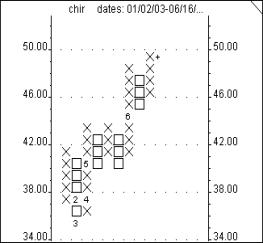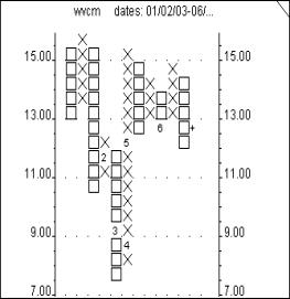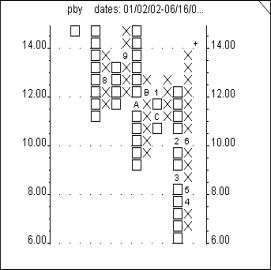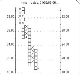 Point & Figure charting dates back to the inception of modern market analysis. It is a unique form of charting in that it is only concerned with price movement, ignoring time constraints. Typically, Point & Figure charts are constructed using a box size that equals one point and requires a 3 box movement for a column reversal. A stock that closes over 100 would require a 3-point move to earn either an X or an O designation. Stocks that close at 20 or below need only a 1/2 point move on a daily basis to generate either an X or O entry.