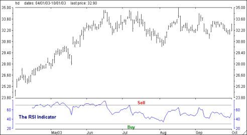 The chart of Home Depot (HD) located below is a good example of price action to be expected when the RSI approaches 70 (Sell) and 30 (Buy). Note the price decline that occurred in early May and mid-June as RSI moved over 70. Conversely, HD recorded a significant bottom in early August as RSI approached 30. RSI also provides a trader with an edge as to when to take a short-term profit, wait for a pullback and then reopen the position.