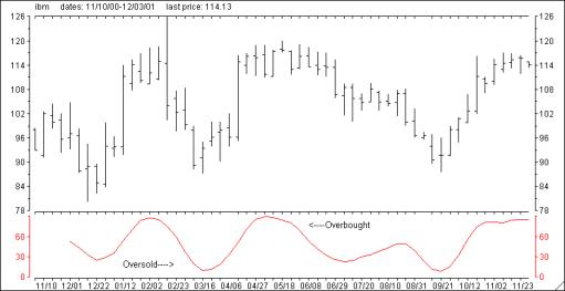 Note that the week ending 3/16/00, Slow %K dipped below 20 when IBM closed at 95. This represented a very oversold situation and an excellent time to purchase IBM shares. IBM proceeded to rally over the next six weeks, topping out at 118 as Slow %K soared to over 80 signaling another overbought condition.