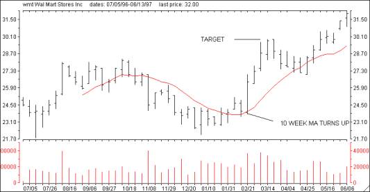 There are several ways to determine realistic targets with the most reliable method being a form of a cyclical analysis. When using cyclical analysis to determine intermediate term price projections, focus on Cycle B which has an average time duration of 20 weeks. In theory, a stock's price would go up for 10 weeks and then decline for 10 weeks completing the 20-week cycle. Construct a half cycle which is simply a 10-week simple moving average. When the moving average turns up, note the closing price for the stock. Now count back 5 weeks and note the stock's closing price. Take the difference between the two closes and add it to the most recent close. That is the preliminary target that should be achieved over the next 5 weeks. Conversely, when the 10-week moving average turns down, note the closing price for the stock. Count back 5 weeks and note the closing price. Take the difference between the two closes and subtract it from the most recent close. That is the preliminary target that should be achieved.