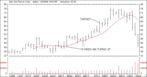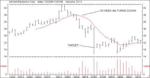 ![]() WMT'S 10 week moving average turned up on 2/28/97 when the stock closed at 26.38. Counting back 5 weeks to 1/24/97 we note the closing price of the stock, 23.00. The 3.38 point difference is added to 26.38 suggesting a target of 29.75, a 13% move. WMT traded through 29.75 the week ending 3/27/97. ![]() KLAC's 10 week moving average turned up on 5/2/97 when the stock closed at 50.00. Counting back 5 weeks to 3/27/97 we note the closing price of the stock, 38 1/4. The 11 3/4 point difference is added to 50.00 suggesting a target of 61 3/4, a 23% move. KLAC traded through 61 during the week ending 7/25/97. ![]() KNT's 50 day moving average turned down on 6/7/96 when the stock closed at 31.00. Counting back 5 weeks to 5/3/96 we note the closing price of the stock, 41.00. The 10 point difference is subtracted from 31.00 suggesting a downside target of 21.00, a 33% move. KNT traded through 21.00 during the week ending 7/12/96 on its way to the mid teens. Computing targets in this manner gives you another tool when narrowing your stock selections. Using a 10-week moving average in this manner is actually measuring the stocks short-term momentum. A large projected gain simply means that the stock has been experiencing a powerful move over the past 5 weeks, a move that is likely to continue. When selecting stocks, you obviously would rather buy one that has a 25% upside potential versus one with only a 5% projection. In the above analysis, KLAC was obviously a better prospect than WMT. The Second Opinion Confidence Rating (C-Rate), located in the Opinion box, is the percentage gain that can be expected for the stock based on this method of calculating targets. The C-rate is calculated by combining the projected percentage move and the Power Rating with the result being a value that can range from -30 to +30. By multiplying the C-Rate by 3, you can estimate the projected percentage move remaining in the stock. A stock that closes at 20 with a C-Rate of 4.5 would have a target of 22.70 (13.5%). As the stock approaches 22.70, the C-Rate will decline until it reaches 0. The most reliable C-Ratings range between +5 to +10 on the bullish side and -5 to -10 for short sale candidates. High C-Rates typically indicate some form of unusual prior trading activity caused by take over rumors or negative earning surprises and are therefore suspect. |